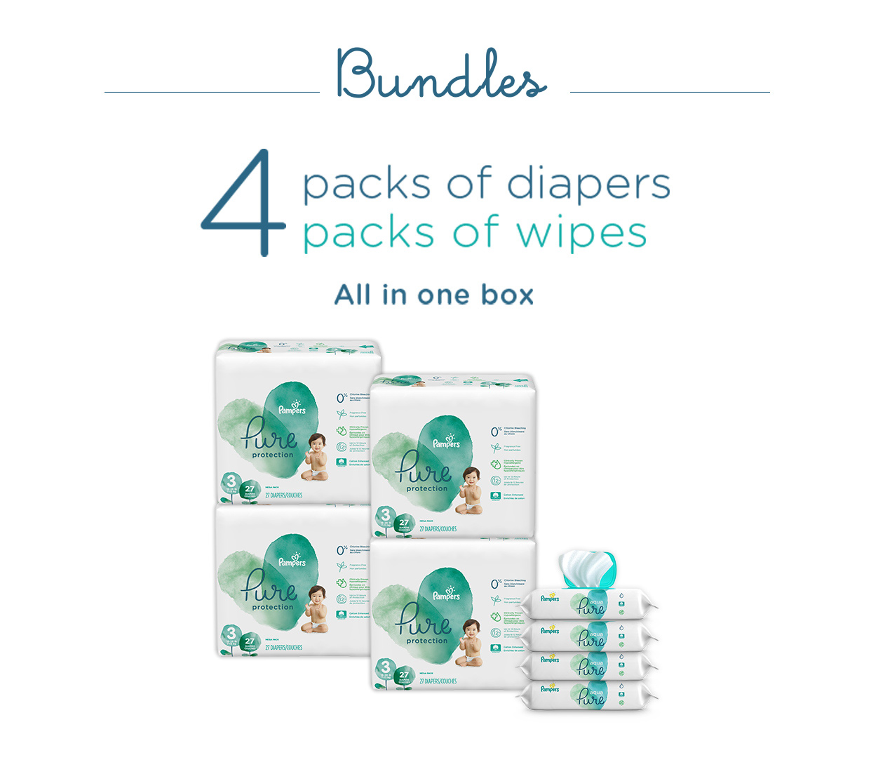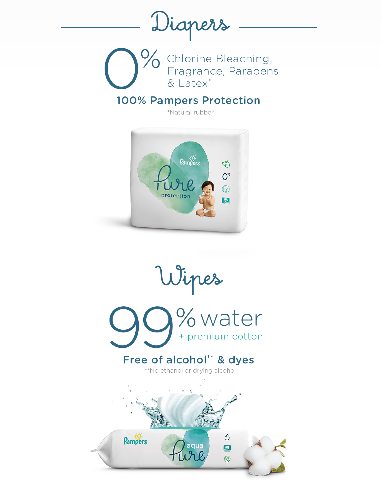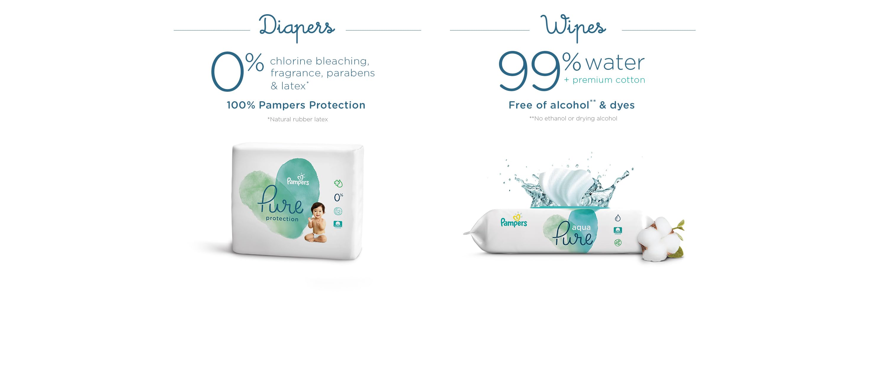 Pampers® Pure Protection Diapers | Pampers DiapersPampers® Pure Protection. Pampers Pure diapers and wipes are created with thoughtful ingredients. Our Pure Protection diapers are crafted with premium cotton, soft plant-based materials, and other thoughtfully selected ingredients. Our Aqua Pure wipes are created with 99% water, a touch of premium cotton, and 1% of our gentle cleansers.