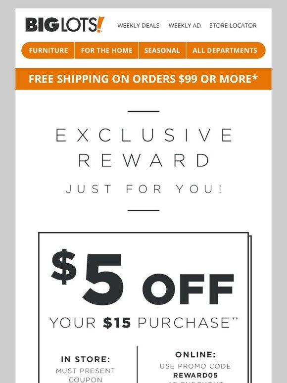 Big Rewards Program - Membership Benefits | Big Lots Big Rewards also includes frequent 20% off coupons, free item weekends, Big Bucks coupons, 10% off for Military/Vets, a Birthday Surprise, and many other exclusive offers throughout the year. Plus, the Rewards you earn can be combined with most of our coupons!
